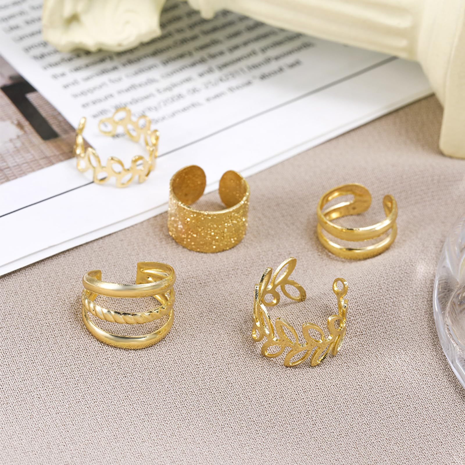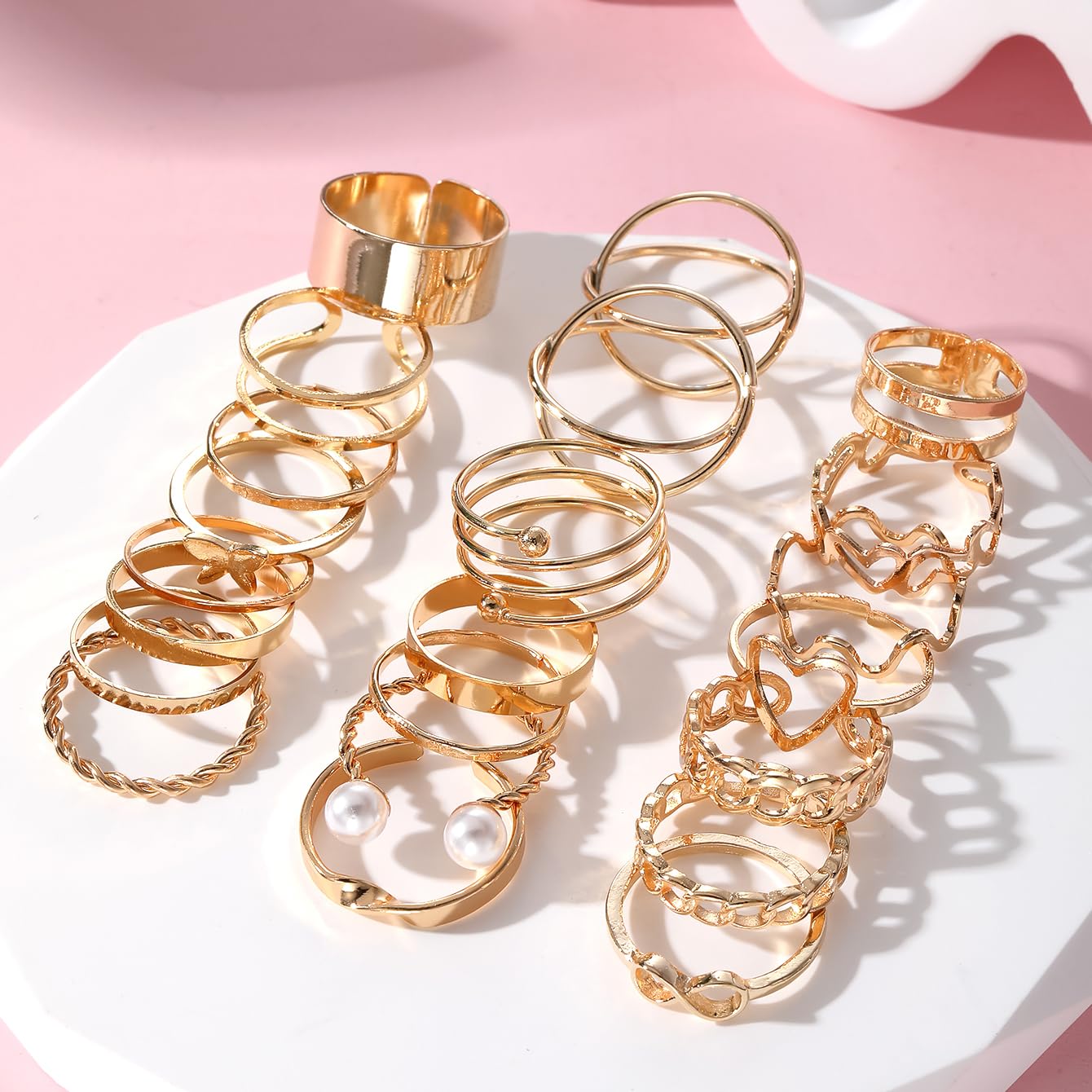 A szett részeként arany színű, különféle mintázatú gyűrűket is találsz: szív, gyöngy, pillangó, lánc és geometrikus formák. Viselheted őket külön-külön vagy egyszerre rétegezve, hogy mindig mást mutass a kezeiden.