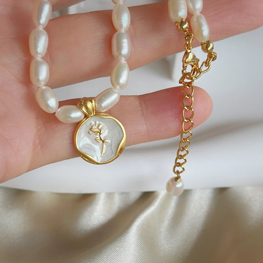 A Dollcini exkluzív ékszerszettje a francia romantika és klasszikus vintage stílus ihlette. A kézzel készített természetes édesvízi gyöngyök lágy fényű csillogással fonják körül a nyakat, míg a gyöngyházfényű zománcozott medál (rózsa vagy tulipán mintával) elegáns hangsúlyt ad a megjelenésnek.