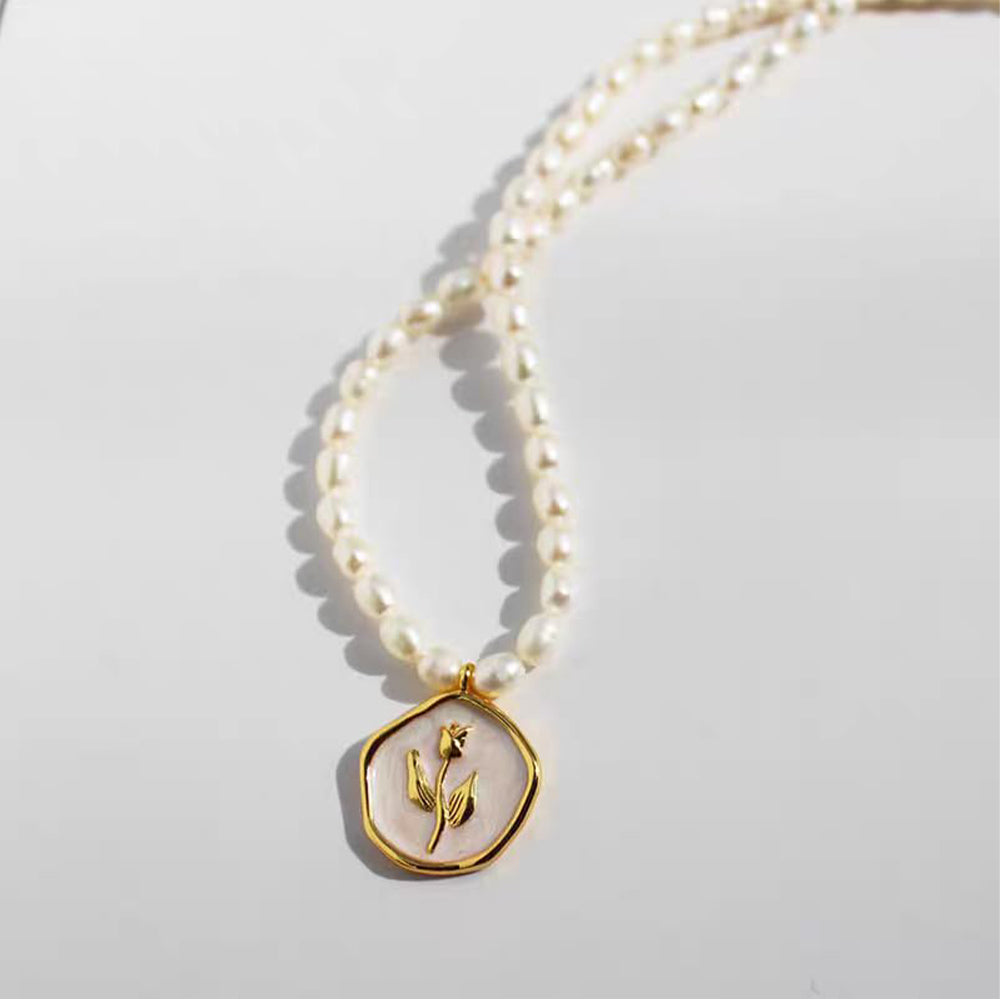 Dollcini Francia stílusú gyöngy ékszerszett – nyaklánc rózsa/tulipán medállal és klasszikus gyöngy fülbevalóval
