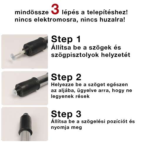Egy kézzel mûködtethetõ A kézi acél szögpisztoly könnyû, kis méretû és 1 kg súlyú. Könnyen kezelhetõ és különféle helyszínekre vihetõ.